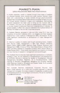 Marketβs MayaΒ deals with understanding of capital markets through psycho-economic perspectives. Accordingly behavioral dimension of capital markets is brought out through several metaphors, imagery and imaginations. Methodology of poetic expression has been used to bring out the mystical side of the markets. This book can be used as supplementary reading material in courses related to fiancΓ© and understanding of markets. To general readers, it offers new ways to understand the mystical behavior of markets that leads to rise and fall of business empires.
