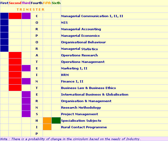 The last three trimesters are devoted to building entrepreneurial abilities in the students because a successful manager is perceived as a wealth creator for the organisation. The chosen specialisation subjects are learnt exhaustively in these three trimesters.