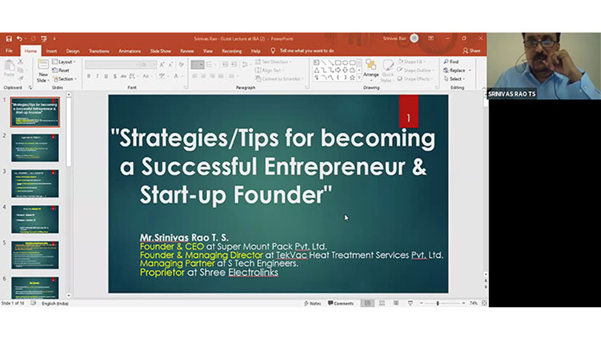Guest Lecture on ‘Strategies/Tips for becoming a Successful Entrepreneur and Start-up Founder‘ Date: 28th August 2021 On 28th July 2021, the students of the newly inducted IBA’s 2021-23 PGDM batch had an interactive session with Mr Srinivas Rao, CEO at Super Mount …