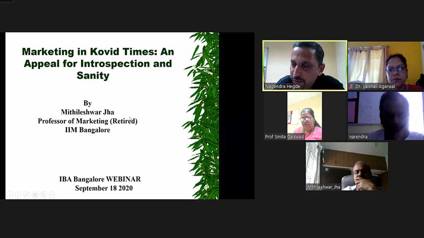 Webinar by Dr. Mithileshwar Jha On “Marketing During COVID Times” Organizer: Indus Business Academy, Bangalore Speaker: Dr Mithileshwar Jha, Professor of Marketing (Retd), IIM, Bangalore Participants: Students and Faculty members of IBA, Research scholars, Faculty members from other institutions, Alumni …